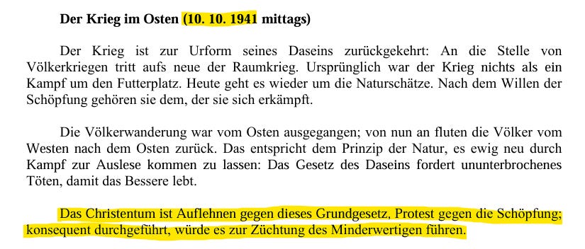Not only is this passage yet another validation of my position that Hitler hated Christ, it also corroborates the Tischgespräch (Table Talk) monologue notes we have from that exact same day.
